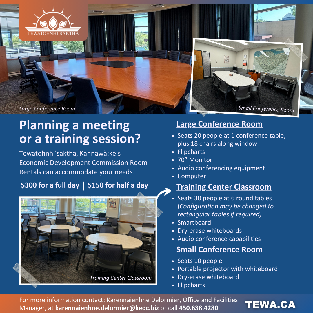 Tewatohnhi’saktha can accommodate all your meeting and training room needs with our Large Conference Room, Small Conference Room, and Training Center Classroom. Our facilities are located on the 3rd floor of the Kahnawà:ke Business Complex. (Food catering options can be suggested if required)