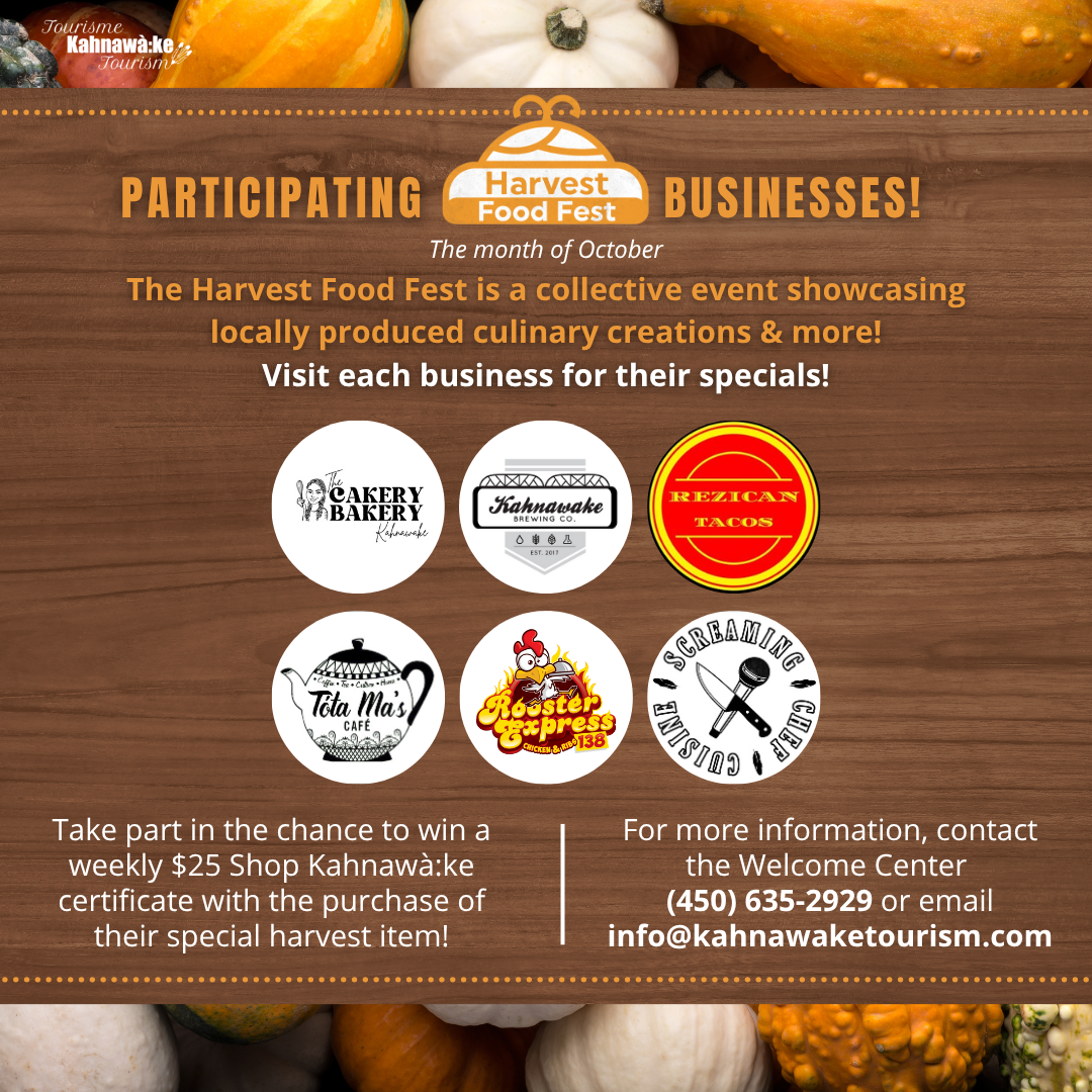 ![]() Harvest Food Fest Participating Businesses: The Cakery Bakery Kahnawake Kahnawake Brewing Company Rezican_Tacos Tóta Ma's Café Rooster Express 138 Screaming Chef Cuisine Take part in the chance to win a weekly $25 Shop Kahnawà:ke certificate with the purchase of their special harvest item! For more information, contact the Welcome Center (450) 635-2929 info@kahnawaketourism.com |