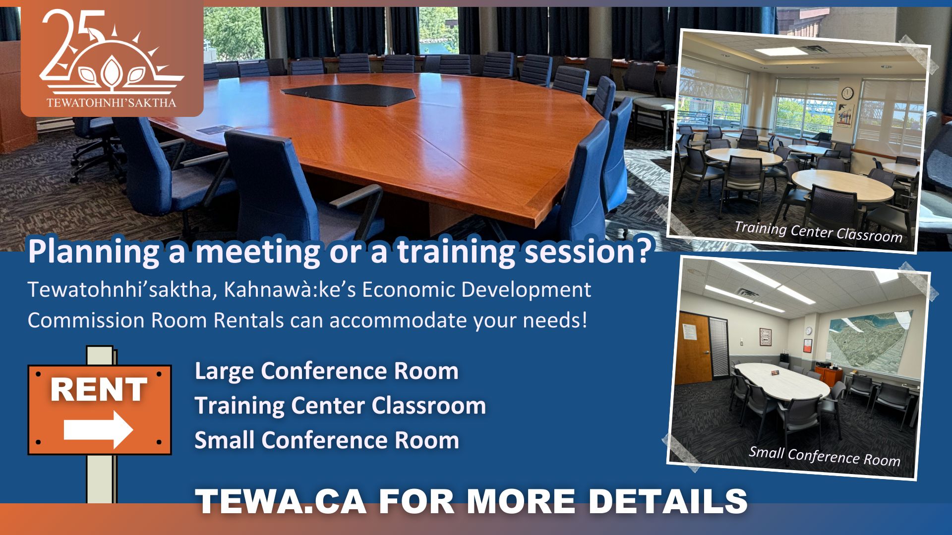 Tewatohnhi’saktha can accommodate all your meeting and training room needs with our Large Conference Room, Small Conference Room, and Training Center Classroom. Our facilities are located on the 3rd floor of the Kahnawà:ke Business Complex. (Food catering options can be suggested if required)